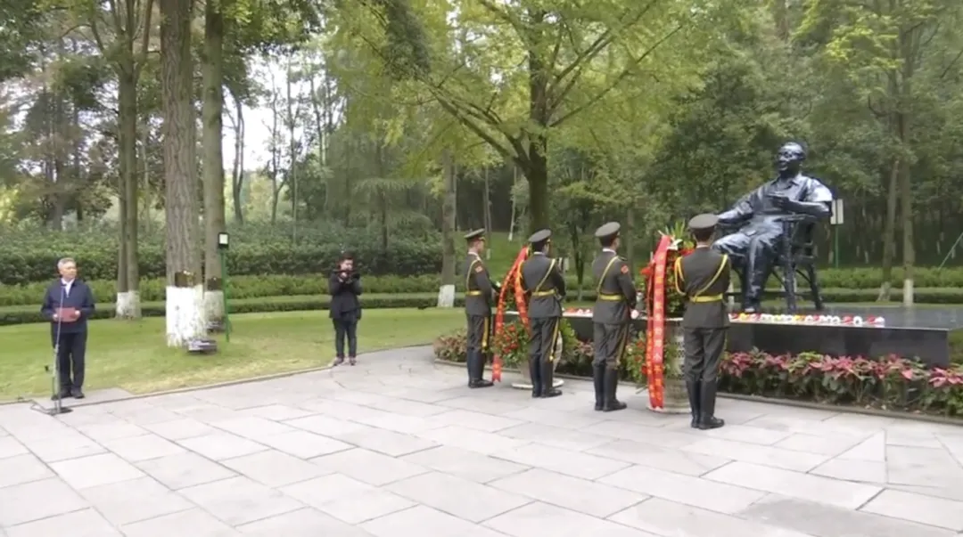 松柏苍翠挺拔,邓小平铜像广场庄严肃穆。仪式上,礼仪伴随着《献花曲》乐声缓缓将花篮摆放在邓小平同志铜像前。唐强、雷文睿代表两地民营经济人士迈步上前,仔细整理花篮缎带,缎带上写着“深切缅怀敬爱的邓小平同志”,寄托怀念和敬仰之情。随后,全体人员向邓小平同志铜像三鞠躬。