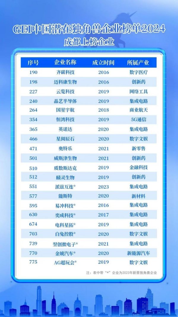 近日,长城战略咨询发布《GEI中国潜在独角兽企业研究报告2024》。成都共21家潜在独角兽企业上榜,来自天府软件园、AI创新中心、天府长岛数字文创园、中国—欧洲中心的7家园区企业成功入选。