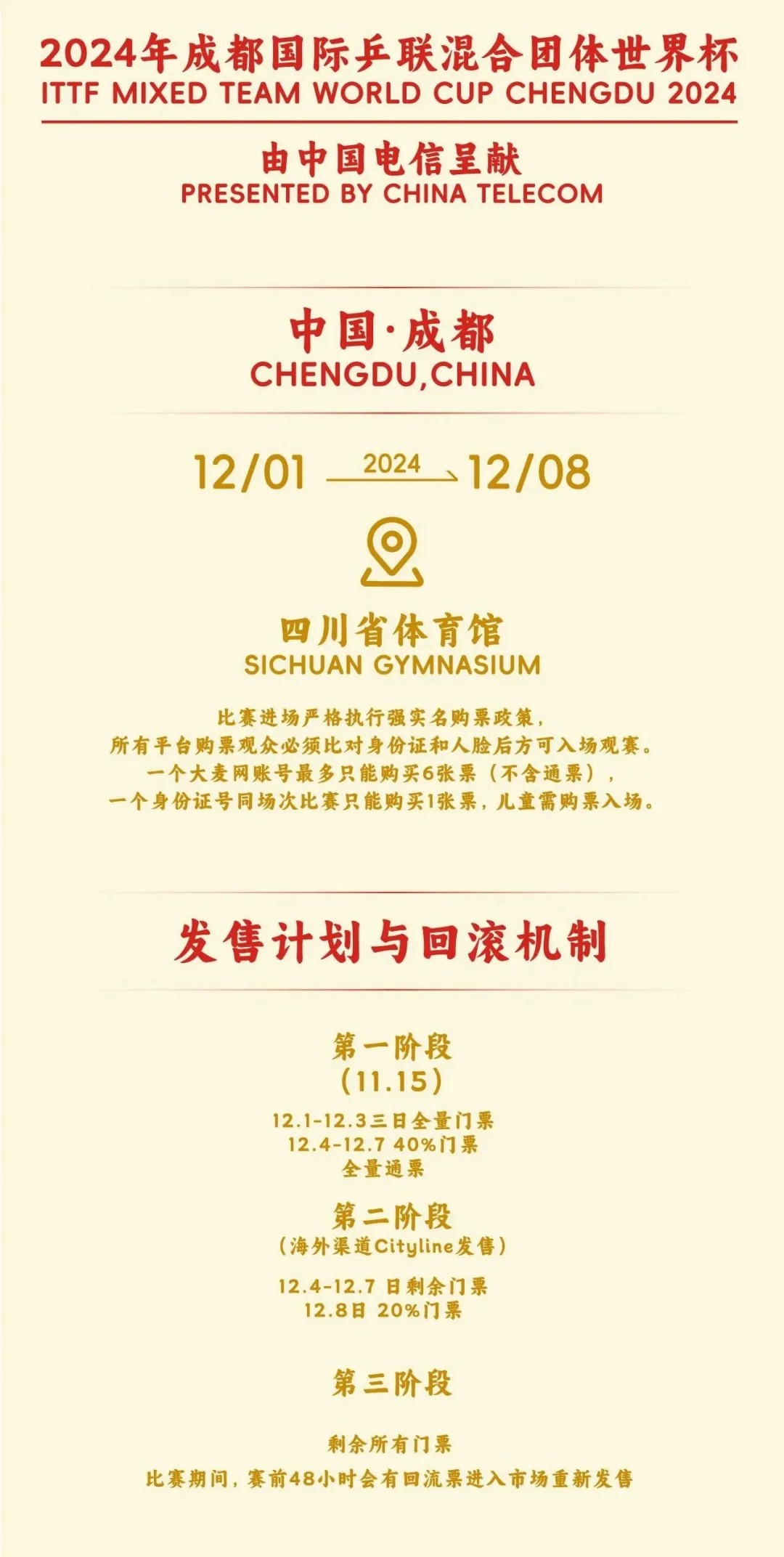 本届成都混合团体世界杯将分为三个阶段:第一阶段比赛时间为12月1日至12月3日,中国队将于1日上午迎来揭幕战的比赛,第二阶段比赛时间为12月4日至7日,半决赛及奖牌赛将于12月8日进行。具体门票发售计划与回滚机制详见下图: