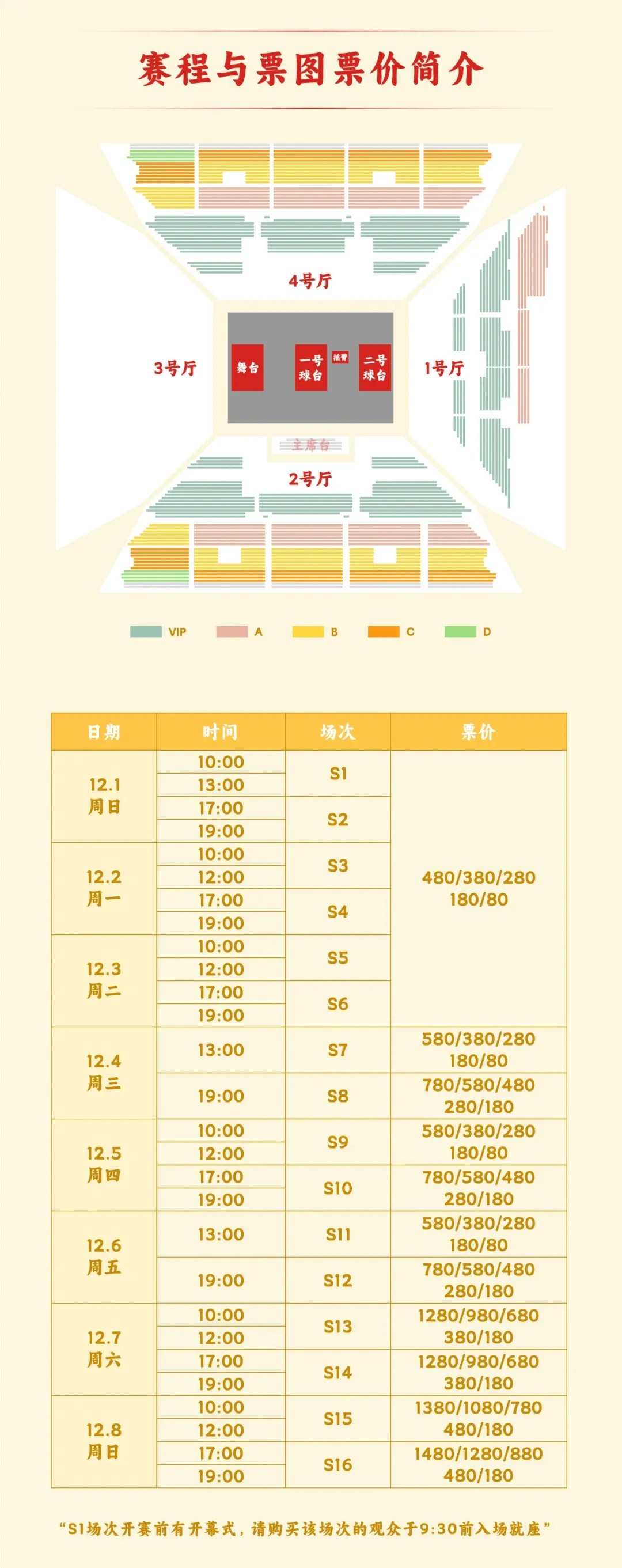 成都混合团体世界杯每场比赛设VIP、A、B、C、D五档票价,票价设定根据赛事白天场、晚上场、周末场不同时间节点以及赛事进行阶段设置不同价位。球迷朋友们可根据自己的需求进行选择,具体赛程及各场次门票价格详见下图: