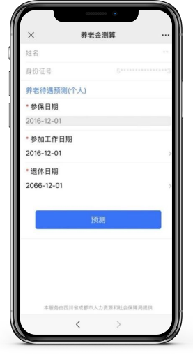此功能测算是基于参保人员已经缴纳养老保险费满15年,根据目前的社保信息进行的测算,因缴费政策、个人缴费情况等因素变化,养老金预测结果仅供参考,参保人员领取的养老金最终以退休时实际计算为准。
