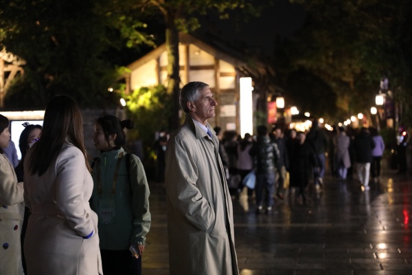 宽窄巷子保留了许多老成都的建筑风貌和生活方式。位于窄巷子27号的一座小洋楼引来北马其顿的嘉宾萨什科·纳塞夫的驻足。这是一座具有欧式风格的建筑,屋顶中式、楼身西式,与周围的传统建筑形成了鲜明的对比。喜欢历史的萨什科·纳塞夫说:“这是我第二次来宽窄巷子,这次又发现了惊喜,喜欢这里的古朴建筑和文化氛围,这些建筑在夜晚的灯光下增加了神秘感,太有魅力了。”