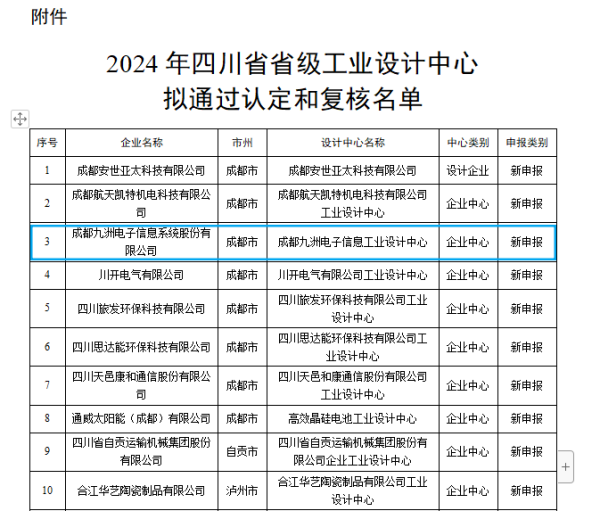 近日,从四川省经信厅获悉,根据《四川省省级工业设计中心认定管理办法》,经市(州)推荐、专家评审、现场抽查、合规性复核等程序,省经信厅确定了2024年四川省省级工业设计中心拟通过认定和复核企业(中心)名单。来自天府软件园企业成都九洲电子信息系统股份有限公司的成都九洲电子信息工业设计中心成功入选该名单。