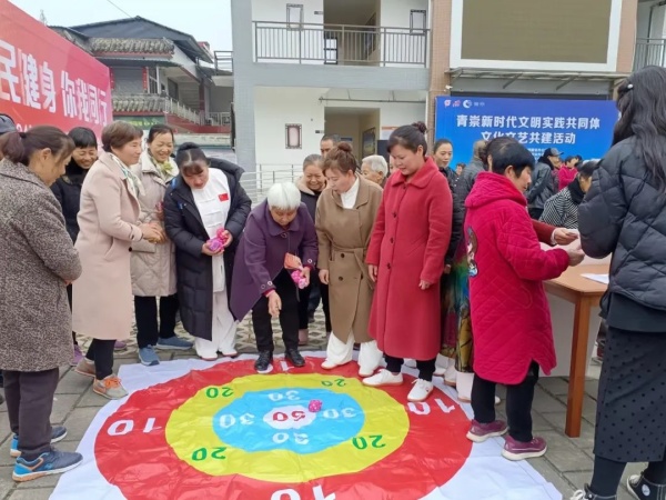 文艺节目表演结束后,趣味运动会在村民们殷切的期待中拉开了帷幕。活动遵循趣味性高、易参与、有锻炼手脑灵活和协调能力功能的原则,设置了欢乐投沙包、蒙眼敲锣、抖球、光盘拔河等项目,每一项活动都充满了趣味与挑战,激发了村民们的参与热情。场上欢声笑语不断,加油声此起彼伏,构成一幅城乡精神文明建设融合发展、村美民乐的美好画卷。