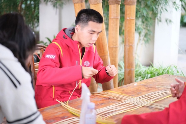 “道明日用竹编是利用川西林盘及丘陵生产的慈竹加工编织而成,过程包括刮青去节、破竹、晒竹、启篾、开丝、拉丝。百斤慈竹,只取八两……”90后省级代表非遗性传承人杨隆梅向大家详细介绍了道明竹编的制作工序,“大家可以尝试把第1、3、5、7根竹篾拿起来,另外再拿一根竹篾穿入,是不是就会变得更简单啦?”杨隆梅老师一边讲着,一边耐心地指导实践。一上一下,一紧一松,从一开始的无从下手到逐渐得心应手,一时间,大家都沉浸于竹编的奇妙世界,感受着传统技艺的精妙之处,“果篮”在手中也渐渐成型。