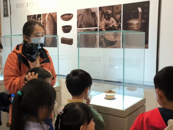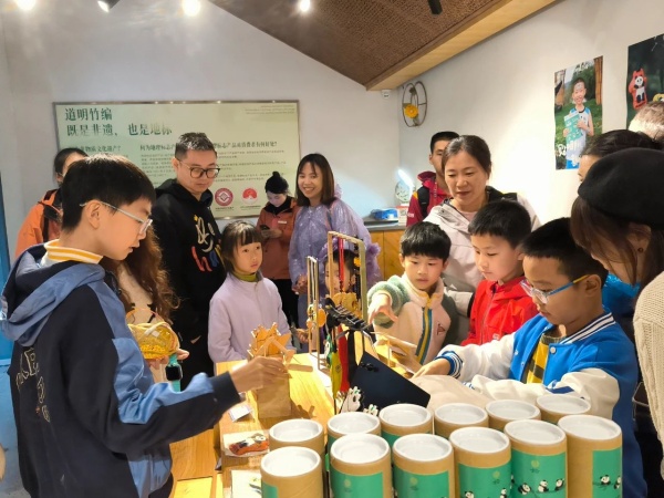竹编体验结束后,大家来到了竹编艺术坊。“道明自古就是产竹之乡,从清朝初年就有平面竹编、瓷胎竹编。‘道明竹编’也是国家非物质文化遗产国家地理标志性产品,而竹艺村便是以竹编艺术品为生的网红艺术村落。”从斗笠、鱼篓,到竹篮、花瓶,再到钱包、茶具,讲解员向大家介绍了道明竹编的历史沿革、传承、发展以及当代的创新运用。大家仿若置身于竹编文化的历史长河,被每一个故事深深吸引,为每一件承载匠心的展品所折服。