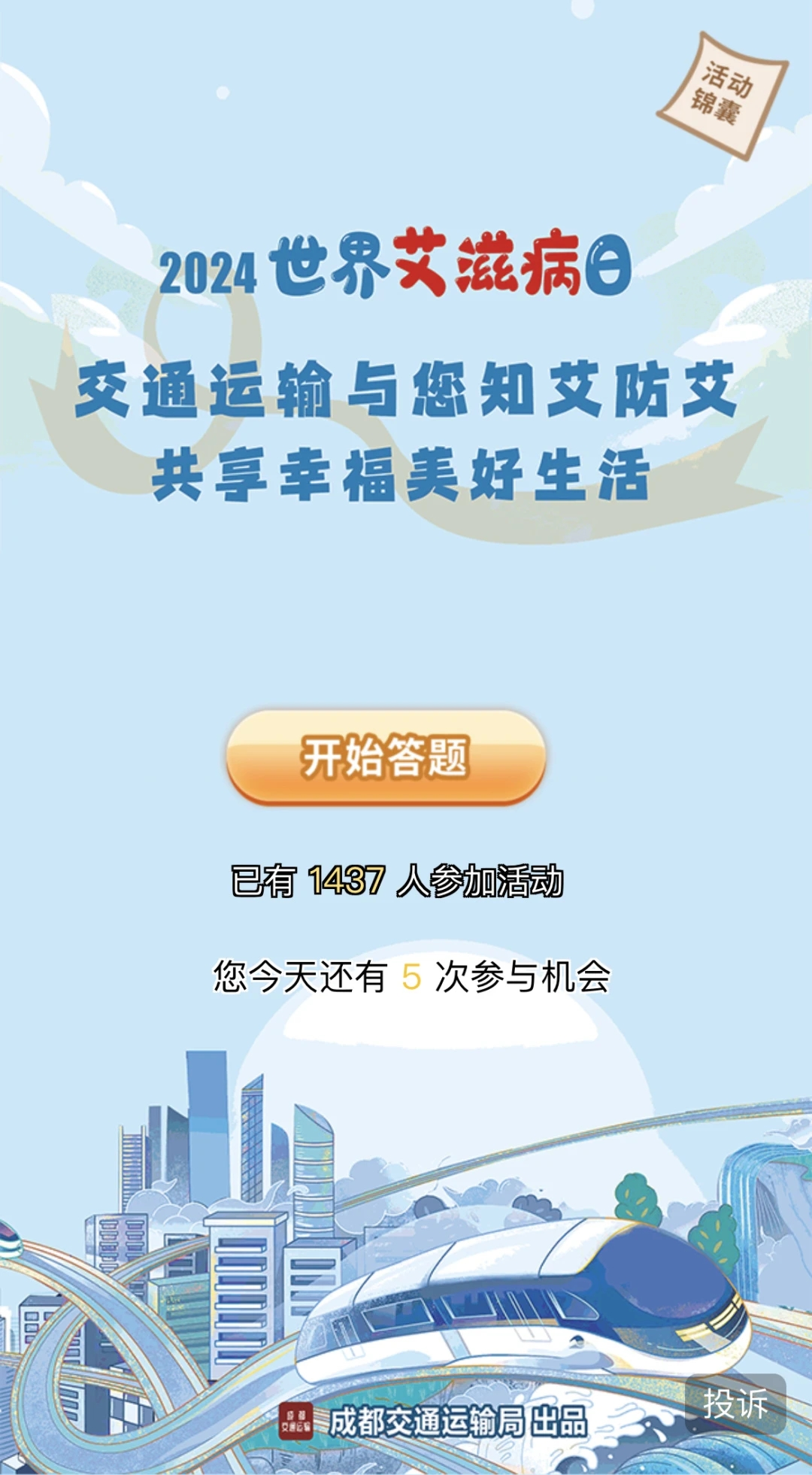 6日上午9点,由成都市交通运输局搭建的2024世界艾滋病日互动答题平台正式上线,通过互动答题模式,将艾滋病相关知识和预防艾滋病的有效措施向广大市民生动呈现,提高市民对艾滋病防治知识知晓率。