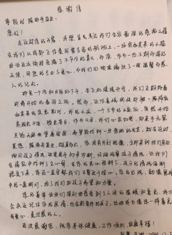 “您的出现,就像黑暗中的一盏明灯,给了我们和孩子希望和力量。您的善举让我们深刻感受到了人间的温暖和善良,我们会永远记住您的恩情……”这封情真意切的感谢信是写给陈雨舟的,落款人为赵先生和朱女士,时间为12月5日。