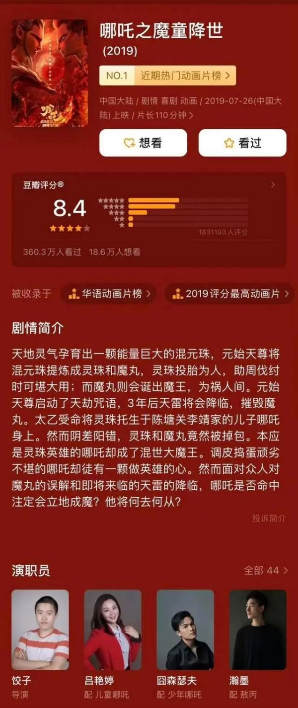 这部被观众称之为国漫崛起的代表作,是一部“成都造”——它的主创团队正是位于成都的可可豆动画影视有限公司,并由成都“鬼才”动画导演饺子执导。影片在根植中国传统神话的同时对人物形象进行了创造性改编,讲述哪吒“生而为魔”却依然逆天不认命、勇敢与命运斗争后成为英雄的成长故事。