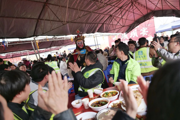 随着坝坝宴开席,放眼望去,68桌整齐排开的坝坝宴一片红红火火,当地厨师们一道道散发着诱人香气、地道的“正兴味”菜肴也深受工友们好评,大家一边大快朵颐,一边感受着异乡别样的家的温暖。大家举杯欢庆腊八佳节,欢声笑语不断。
