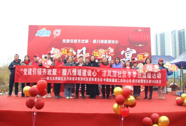 1月7日,在四川天府新区正兴街道凉风顶社区建设者之家,一场以“党建引领齐欢聚 腊八情暖建设心”为主题的冬季送温暖暨喜迎新春活动温暖举行。中建新疆建工西南公司四川经理部作为共建单位之一参与其中,为社区建设者们送上温暖的腊八粥与节日祝福。